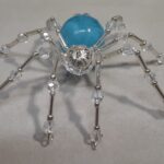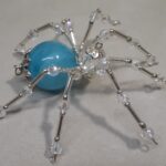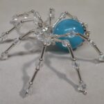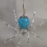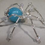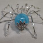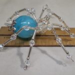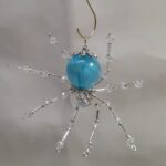This is a handmade beaded spider. The abdominal area is made from a large blue plastic bead and the head is a smaller plastic clear faceted bead. The legs are made from flexible but sturdy 21 ga. brass wire which are covered with small Swarovski glass beads and glass silver beads. Silver bead caps are also incorporated into the body. A 1.75″ golden hook is attached to the back of the abdomen and can be used to hang the spider or be removed.