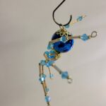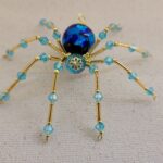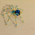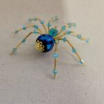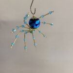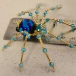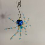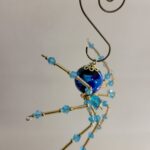 This is a handmade beaded crystalline ice spider. The abdominal area is made from a dark blue glass bead. The head is a smaller faceted clear blue bead. The legs are made from flexible but sturdy 21 ga. wire which are covered with small Swarovski Glass and plastic beads that can be carefully adjusted to almost any position. Golden bead caps are also incorporated into the body. A decorative hook is attached to the back of the abdomen and can be used to hang the spider or be removed.
