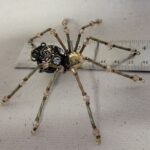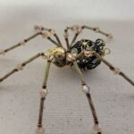 This is a handmade beaded spider. The abdominal area is made from a large scrolled brass owl finding with 2 jewels mounted in the front which look as though they are head lights on the front of the abdomen. The head from a smooth gold bead. The legs are made from 21 ga. wire which are covered with small gold Swarovski Glass crystal beads and twisted gold glass beads. Gold bead caps are also incorporated into the body. A gold decorative hook is attached to the back of the abdomen and can be used to hang the spider or be removed.