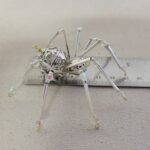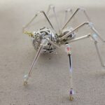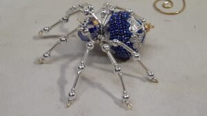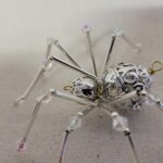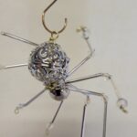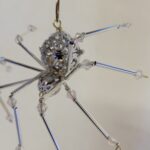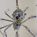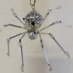 This is a handmade beaded spider. The abdominal area is made from a large scrolled silver finding and the head from a smooth silver bead. The legs are made from 21 ga. wire which are covered with small clear Swarovski Glass crystal beads and silver glass beads. Silver bead caps are also incorporated into the body. A gold decorative hook is attached to the back of the abdomen and can be used to hang the spider or be removed.
