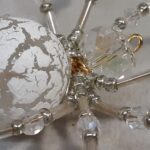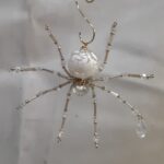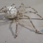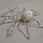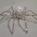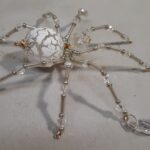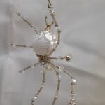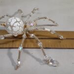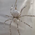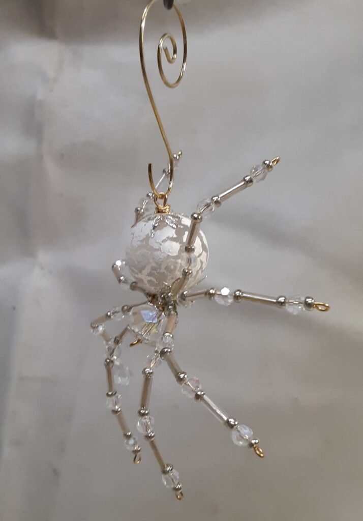 This is a handmade beaded crystalline ice spider. The abdominal area is made from a largerfrosted clear crystal bead with a smaller faceted clear bead for the head. The legs are made from flexible but sturdy 21 ga. wire which are covered with small clear Swarovski Glass beads and can be carefully adjusted to almost any position. Silver bead caps are also incorporated into the body. A gold decorative hook is attached to the back of the abdomen and can be used to hang the spider or be removed.