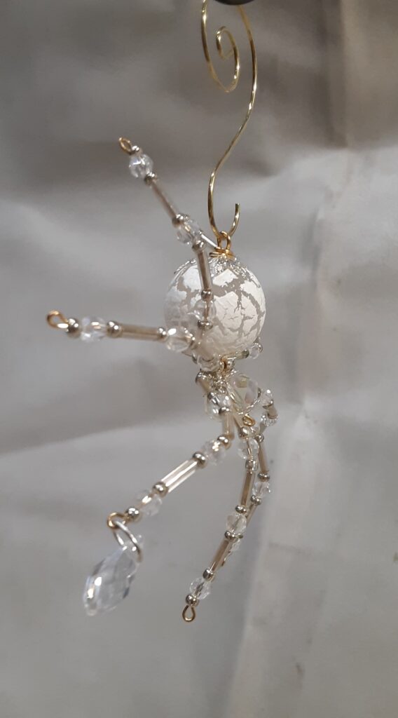 This is a handmade beaded crystalline ice spider. The abdominal area is made from a largerfrosted clear crystal bead with a smaller faceted clear bead for the head. The legs are made from flexible but sturdy 21 ga. wire which are covered with small clear Swarovski Glass beads and can be carefully adjusted to almost any position. Silver bead caps are also incorporated into the body. A gold decorative hook is attached to the back of the abdomen and can be used to hang the spider or be removed.