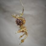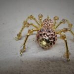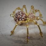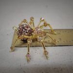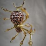 This is a handmade golden beaded spider. The abdomen is made from a rose gold gem encrusted bead (gives you the impression of a wolf spider with babies clinging to her back) and the head is a smaller rose gold bead. The legs are made from flexible but sturdy 21 ga. wire which are covered with small golden glass and Swarovski Crystal glass beads. They can be carefully adjusted to almost any position. Gold bead caps are also incorporated into the body. A decorative gold hook is attached to the back of the abdomen and can be used to hang the spider or be removed.