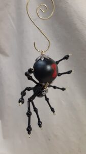 This is a handmade golden beaded spider. The abdomen is made from a rose gold gem encrusted bead (gives you the impression of a wolf spider with babies clinging to her back) and the head is a translucent copper plastic bead. The legs are made from flexible but sturdy 21 ga. wire which are covered with small golden plastic and Swarovski Crystal glass beads. Gold bead caps are also incorporated into the body. A decorative gold hook is attached to the back of the abdomen and can be used to hang the spider or be removed.