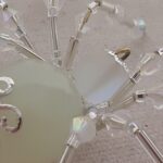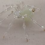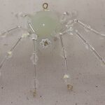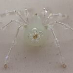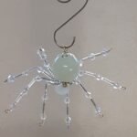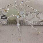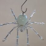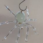 This is a handmade beaded spider. The abdominal area is made from an 18 mm Jade stone bead and the head is a smaller 10 mm crystal glass bead. The legs are made from flexible but sturdy 21 ga. brass wire which are covered with small clear crystal beads and glass silver beads that can be carefully adjusted to almost any position. Silver bead caps are also incorporated into the body. A 1.75″ golden hook is attached to the back of the abdomen and can be used to hang the spider or be removed.