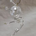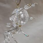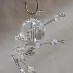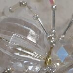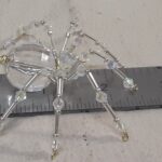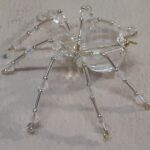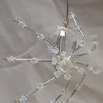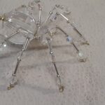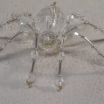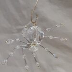 This is a handmade beaded crystalline ice spider. The abdominal area is made from a larger faceted clear glass crystal bead with a smaller faceted clear glass bead for the head. The legs are made from flexible but sturdy 21 ga. brass wire which are covered with small clear glass crystal beads and silver glass seed beads that can be carefully adjusted to almost any position. Silver bead caps are also incorporated into the body. A gold decorative hook is attached to the back of the abdomen and can be used to hang the spider or be removed.