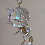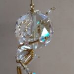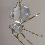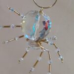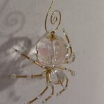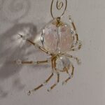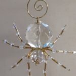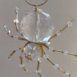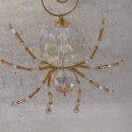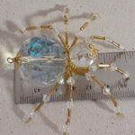 This is a handmade beaded crystalline ice spider. The abdominal area is made from a larger 30 mm faceted clear glass crystal bead with a smaller faceted clear glass bead for the head. The legs are made from flexible but sturdy 21 ga. brass wire which are covered with small glass beads that can be carefully adjusted to almost any position. Gold bead caps are also incorporated into the body. A gold decorative hook is attached to the back of the abdomen and can be used to hang the spider or be removed.