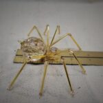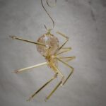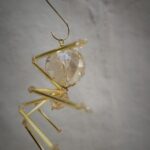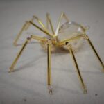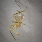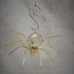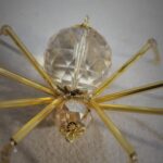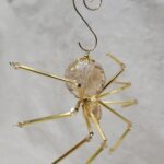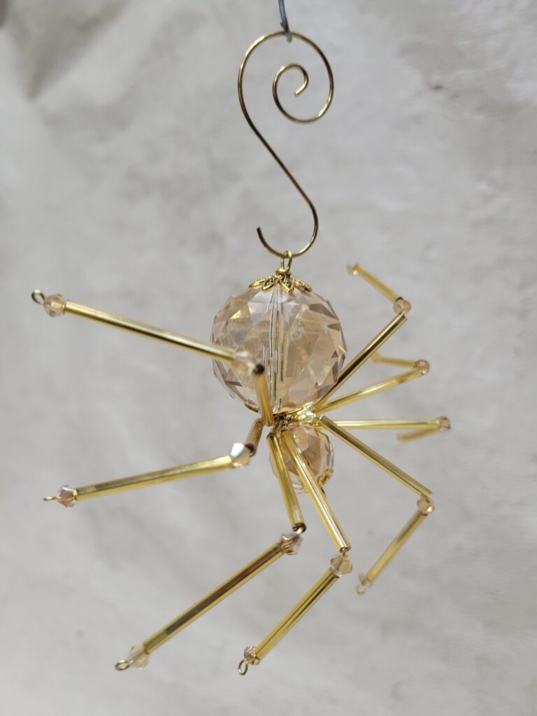 This is a handmade beaded crystalline ice spider. The abdominal area is made from a larger 30 mm faceted clear glass crystal bead with a smaller faceted clear glass bead for the head. The legs are made from flexible but sturdy 21 ga. brass wire which are covered with small glass beads that can be carefully adjusted to almost any position. Gold bead caps are also incorporated into the body. A gold decorative hook is attached to the back of the abdomen and can be used to hang the spider or be removed.