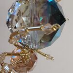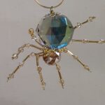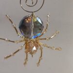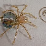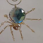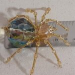 This is a handmade beaded crystalline ice spider. The abdominal area is made from a large 30 mm faceted clear iridescent glass crystal bead with a smaller faceted clear gold glass bead for the head. The legs are made from flexible but sturdy 21 ga. brass wire which are covered with small glass beads that can be carefully adjusted to almost any position. Gold bead caps are also incorporated into the body. A gold decorative hook is attached to the back of the abdomen and can be used to hang the spider or be removed.
