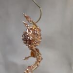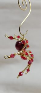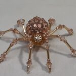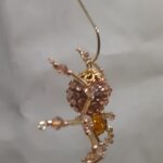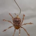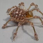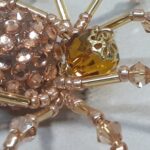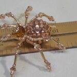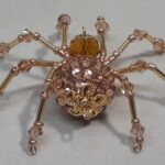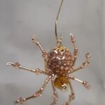 This is a handmade golden beaded spider. The abdomen is made from a rose gold gem encrusted bead (gives you the impression of a wolf spider with babies clinging to her back) and the head is a faceted amber plastic bead. The legs are made from flexible but sturdy 21 ga. brass wire which are covered with small golden glass and Swarovski Crystal glass beads. Gold bead caps are also incorporated into the body. A decorative gold hook is attached to the back of the abdomen and can be used to hang the spider or be removed.