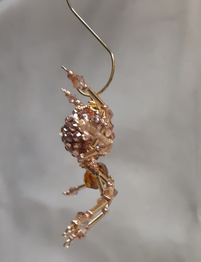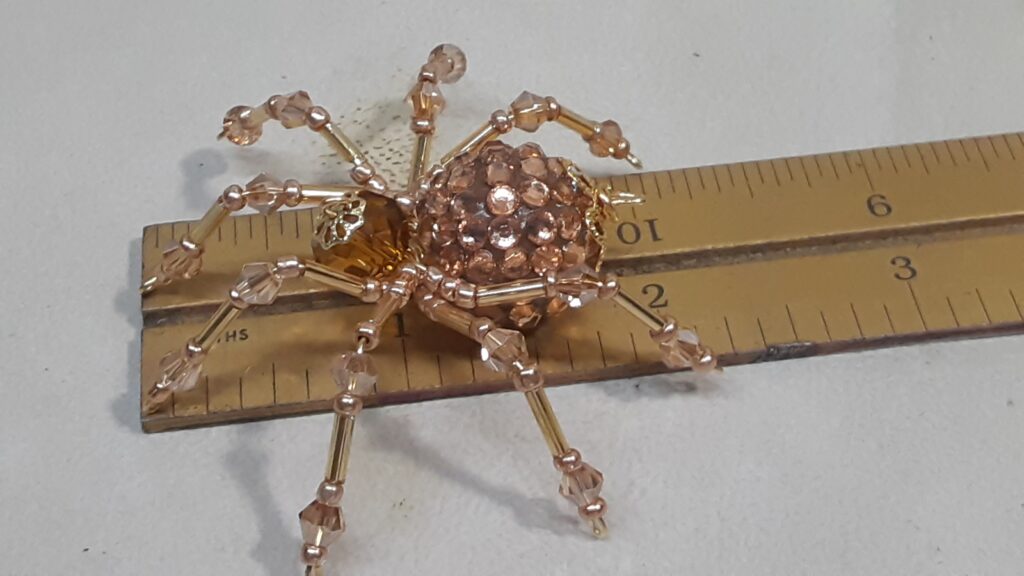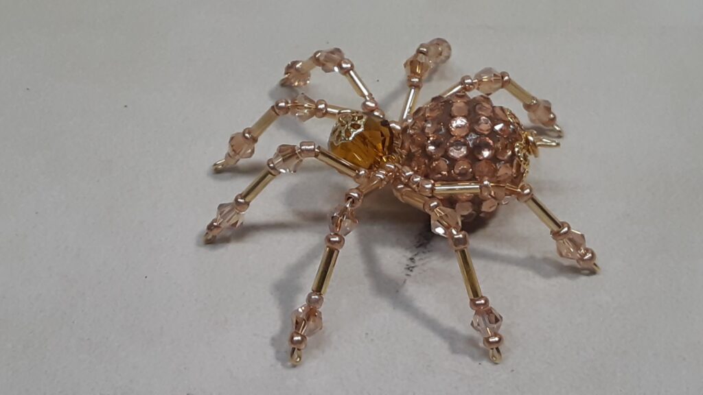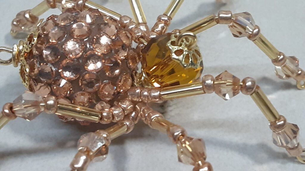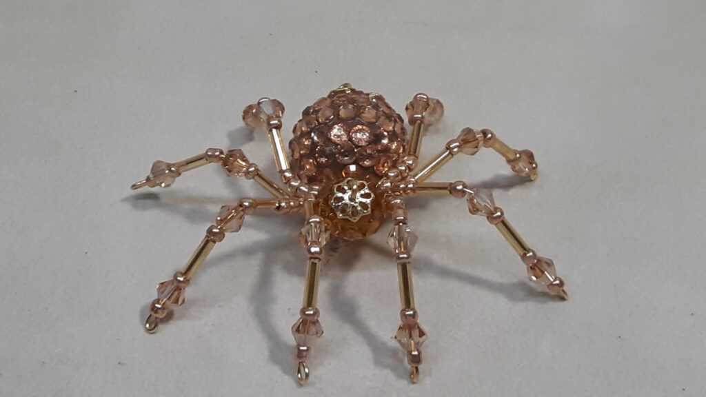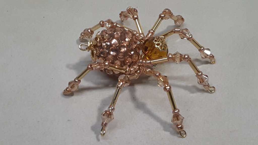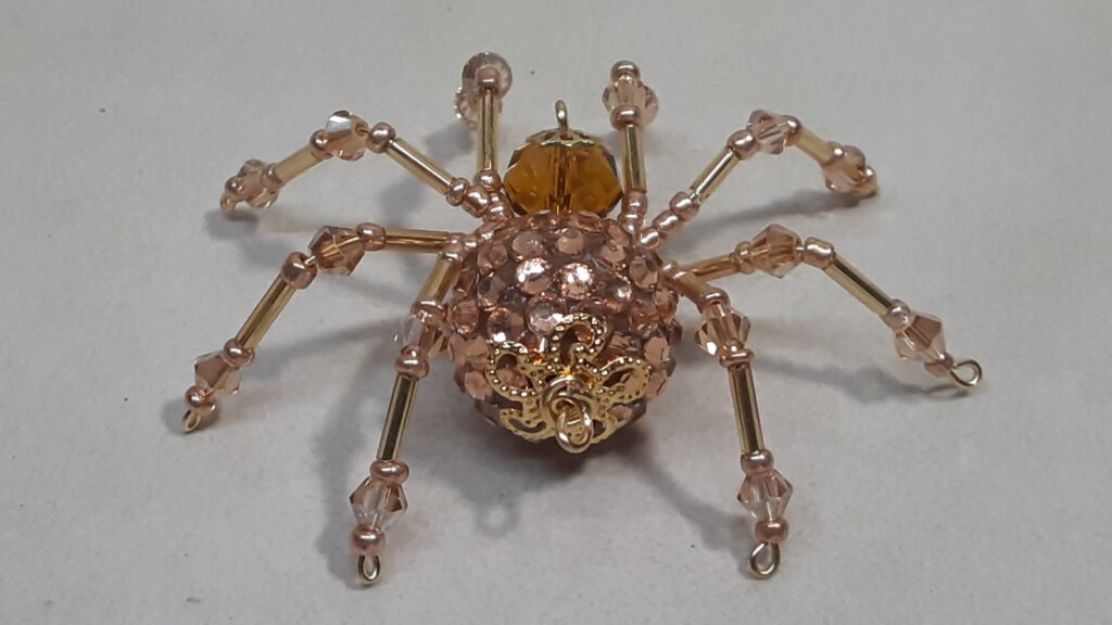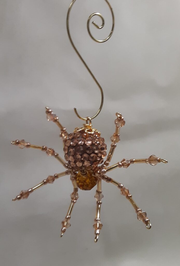This is a handmade golden beaded spider. The abdomen is made from a rose gold gem encrusted bead (gives you the impression of a wolf spider with babies clinging to her back) and the head is a faceted amber plastic bead. The legs are made from flexible but sturdy 21 ga. brass wire which are covered with small golden glass and Swarovski Crystal glass beads. Gold bead caps are also incorporated into the body. A decorative gold hook is attached to the back of the abdomen and can be used to hang the spider or be removed.