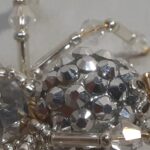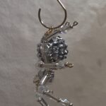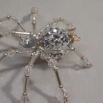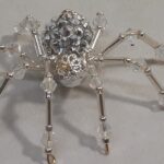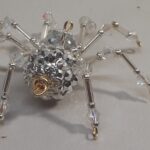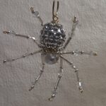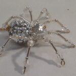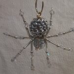 This is a handmade silver beaded spider. The abdomen is made from a silver gem encrusted bead (gives you the impression of a wolf spider with babies clinging to her back) and the head is a silver faceted plastic bead. The legs are made from flexible but sturdy 21 ga. brass wire which are covered with small silver glass beads and Swarovski Crystal glass beads. Silver bead caps are also incorporated into the body. A decorative gold hook is attached to the back of the abdomen and can be used to hang the spider or be removed.