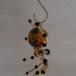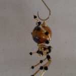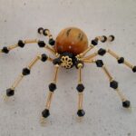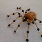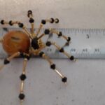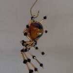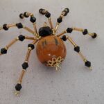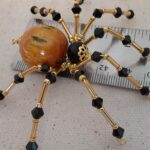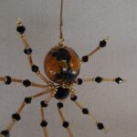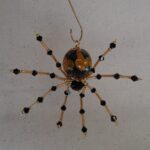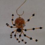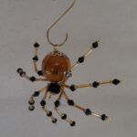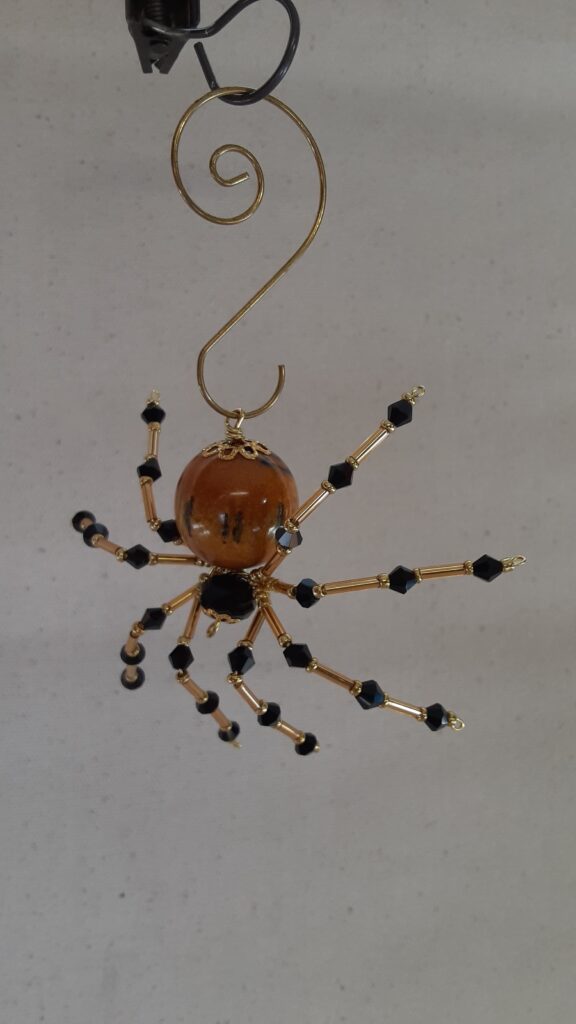 This is a handmade beaded crystalline spider. The abdominal area is made from a swirled Amber acrylic bead and the head from a smaller black faceted bead. The legs are made form 21 ga. brass wire which are covered with small black Swarovski Glass beads and gold glass beads that can be carefully adjusted to almost any position. Gold bead caps are also incorporated into the body. A gold decorative hook is attached to the back of the abdomen and can be used to hang the spider or be removed.