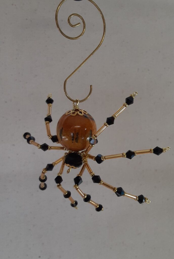 This is a handmade beaded crystalline spider. The abdominal area is made from a swirled Amber acrylic bead and the head from a smaller black faceted bead. The legs are made form 21 ga. brass wire which are covered with small black Swarovski Glass beads and gold glass beads that can be carefully adjusted to almost any position. Gold bead caps are also incorporated into the body. A gold decorative hook is attached to the back of the abdomen and can be used to hang the spider or be removed.