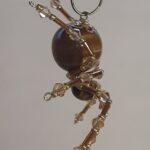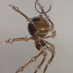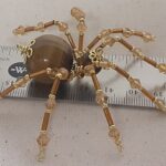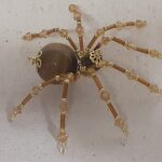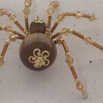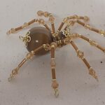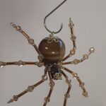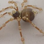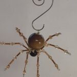 This is a handmade beaded spider. The abdominal area is made from a 20 mm Tiger Eye stone bead and the head is a smaller 10 mm Tiger Eye stone bead. The legs are made from flexible but sturdy 21 ga. brass wire which are covered with small gold crystal beads and glass gold beads that can be carefully adjusted to almost any position. Gold bead caps are also incorporated into the body. A 1.75″ golden hook is attached to the back of the abdomen and can be used to hang the spider or be removed.