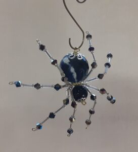 This is a handmade beaded spider. The abdominal area is made from a 20 mm Teal Magnesite stone bead and the head is a smaller 14 mm Magnesite stone bead. The legs are made from flexible but sturdy 21 ga. brass wire which are covered with small gold crystal beads and glass gold beads that can be carefully adjusted to almost any position. Gold bead caps are also incorporated into the body. A 1.75″ golden hook is attached to the back of the abdomen and can be used to hang the spider or be removed.