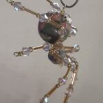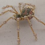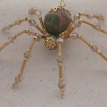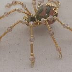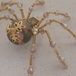 This is a handmade beaded crystalline spider. The abdominal area is made from a 20 mm Unakite stone bead and the head from a smaller green faceted bead. The legs are made form 21 ga. brass wire which are covered with small clear Swarovski Glass beads and gold glass beads that can be carefully adjusted to almost any position. Gold bead caps are also incorporated into the body. A gold decorative hook is attached to the back of the abdomen and can be used to hang the spider or be removed.