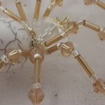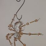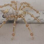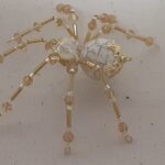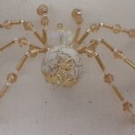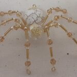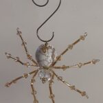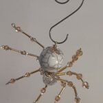 This is a handmade beaded spider. The abdominal area is made from an 18 mm White Magnesite stone bead and the head is a smaller 14 mm crystal faceted bead. The legs are made from flexible but sturdy 21 ga. brass wire which are covered with small gold crystal beads and glass gold beads that can be carefully adjusted to almost any position. Gold bead caps are also incorporated into the body. A 1.75″ golden hook is attached to the back of the abdomen and can be used to hang the spider or be removed.