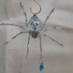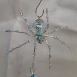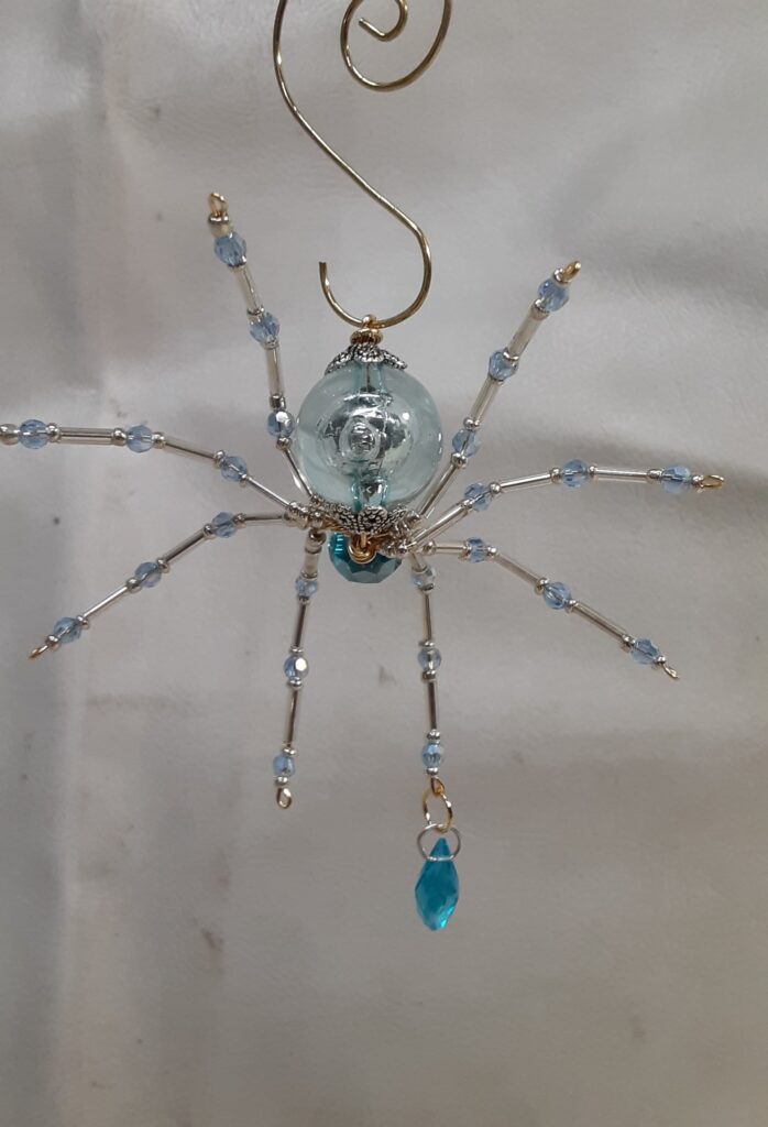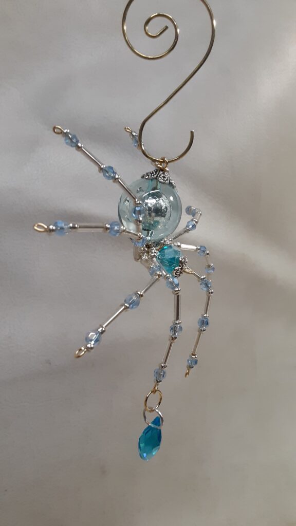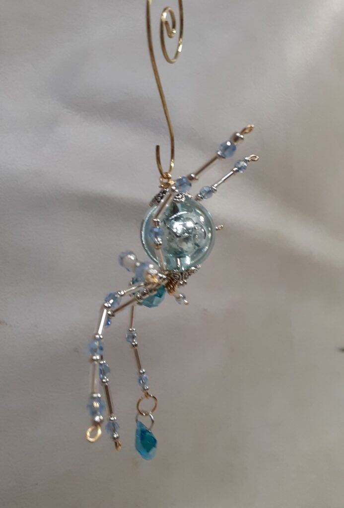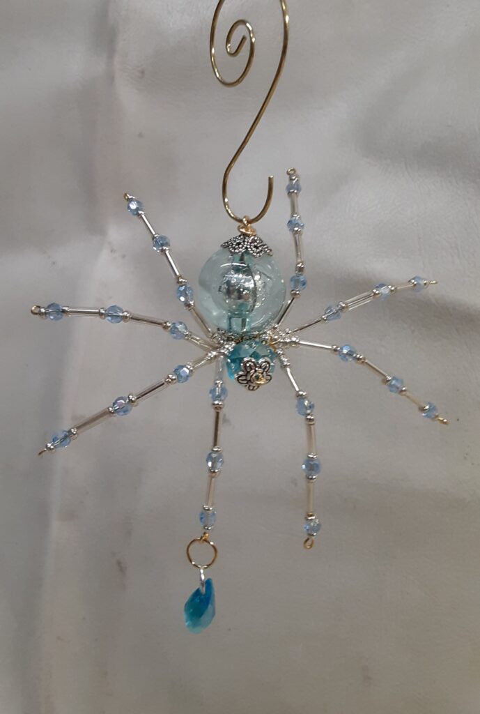 This is a handmade beaded crystalline ice spider. The abdominal area is made from a clear blue tinted plastic bead with a silver foil interior. The head is a smaller faceted clear blue bead. The legs are made from flexible but sturdy 21 ga. brass wire which are covered with small Swarovski Glass and plastic beads. Silver bead caps are also incorporated into the body. A gold decorative hook is attached to the back of the abdomen and can be used to hang the spider or be removed.