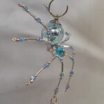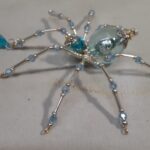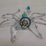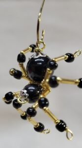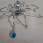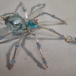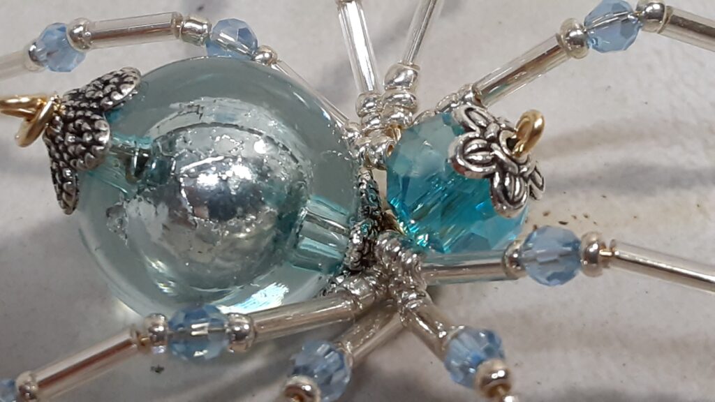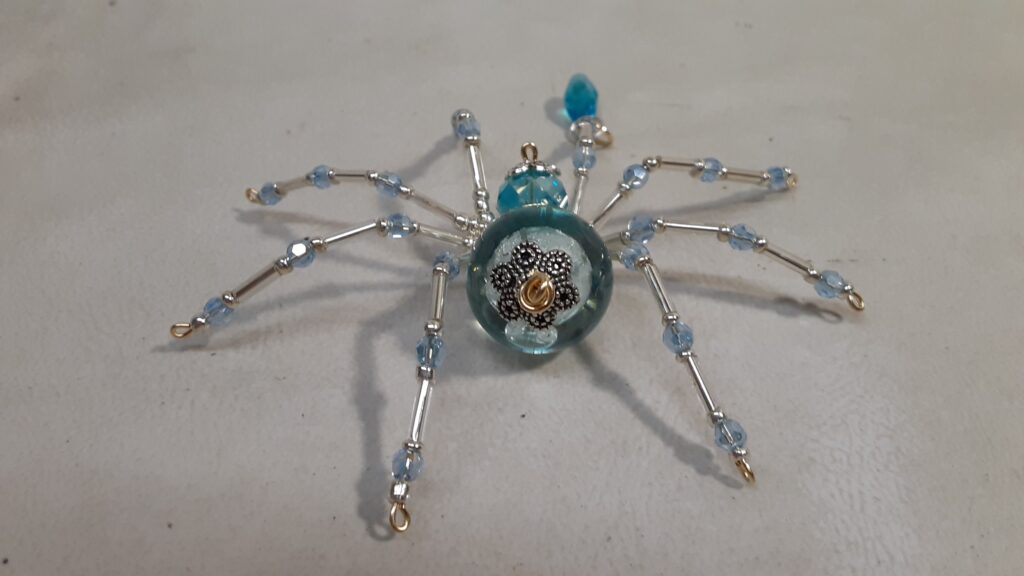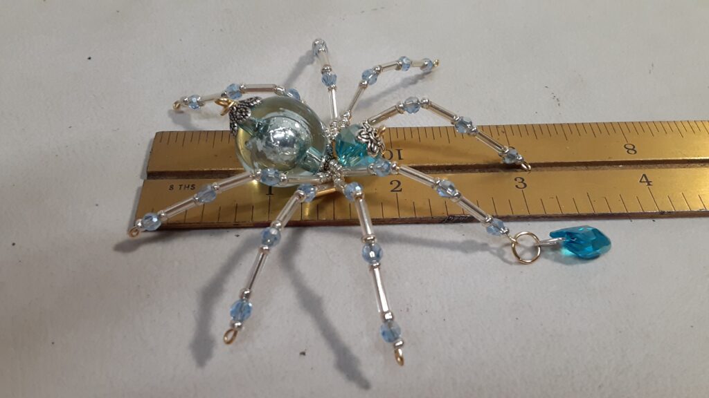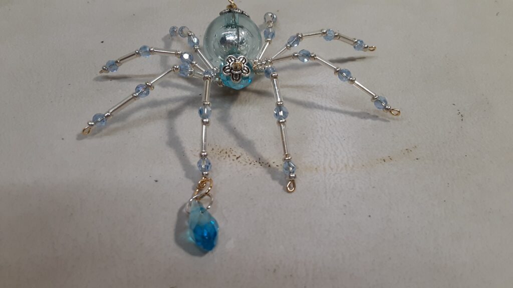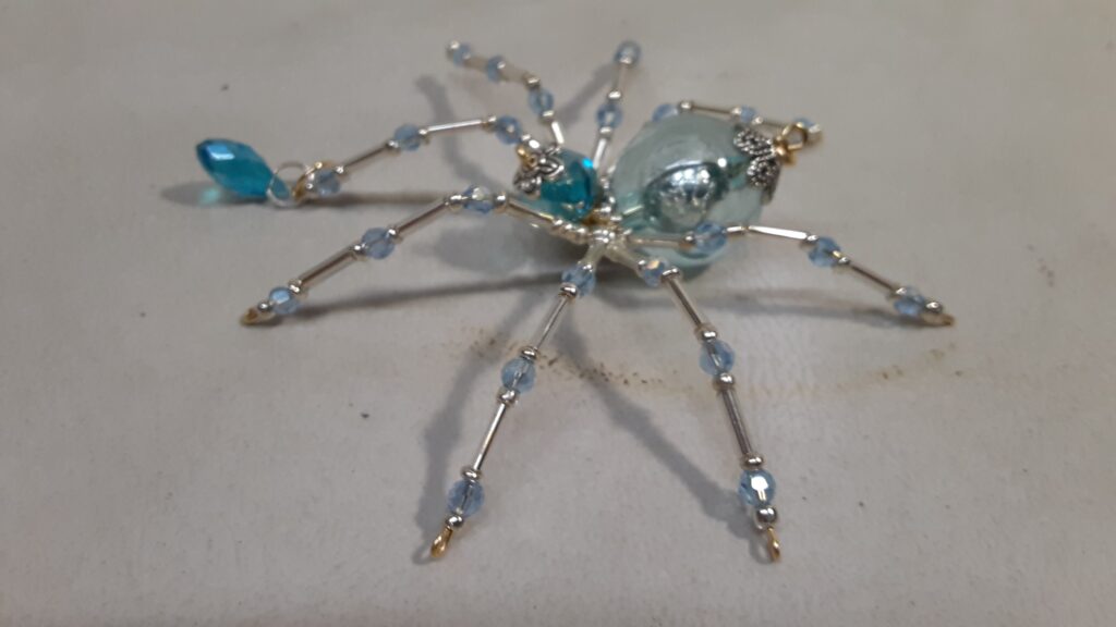A small droplet shaped clear faceted bead is attached to one of the front legs to simulate a dew drop falling from the spiders’ leg.