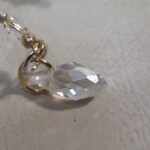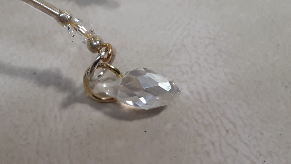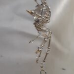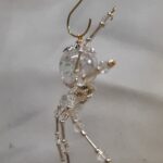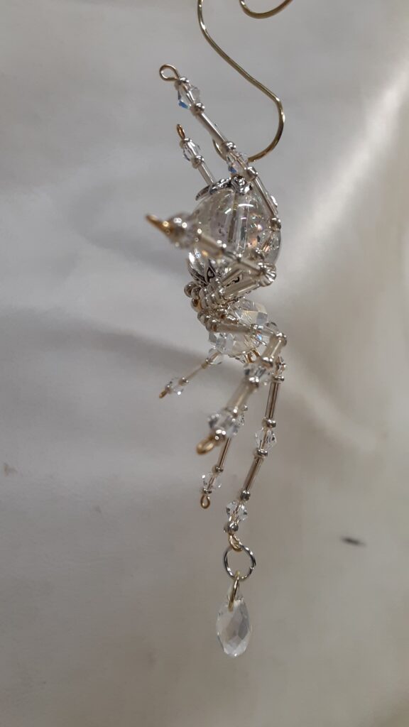 A small faceted tear drop shaped bead is attached to the leg to give it the appearance of a dew drop falling off it’s leg.