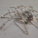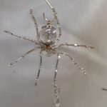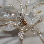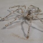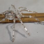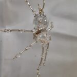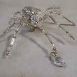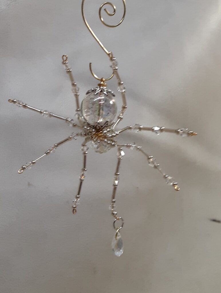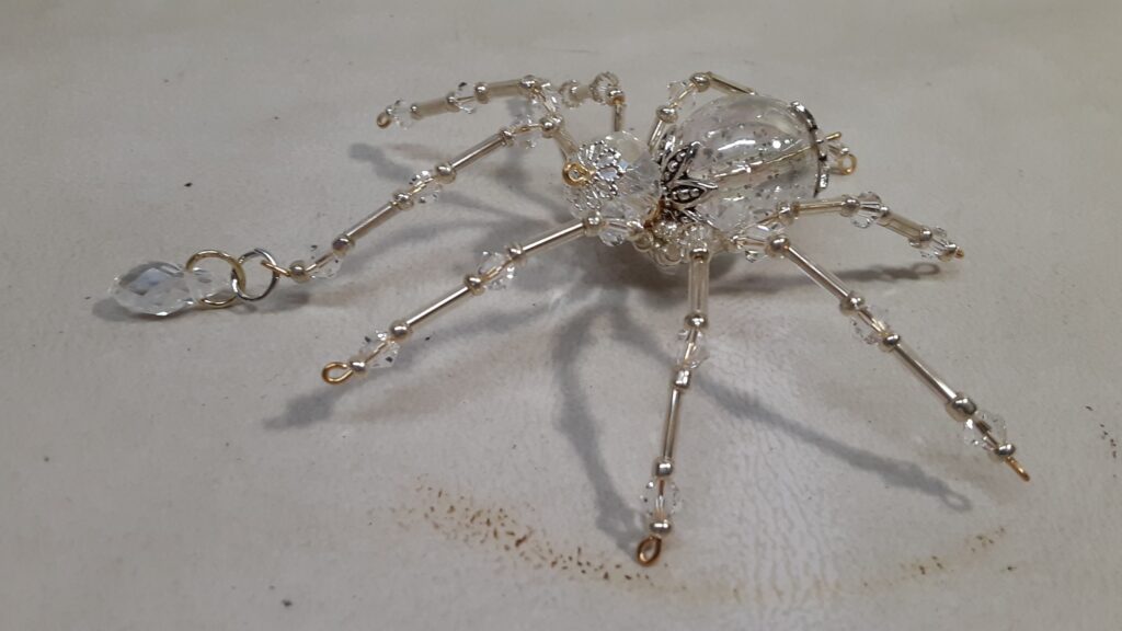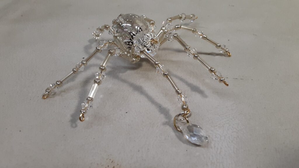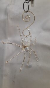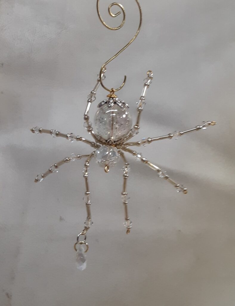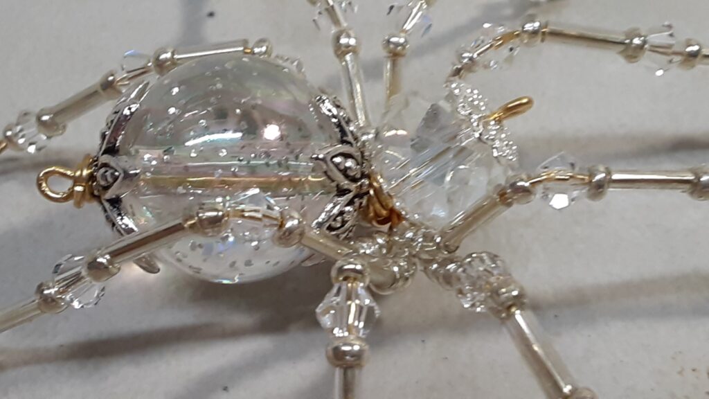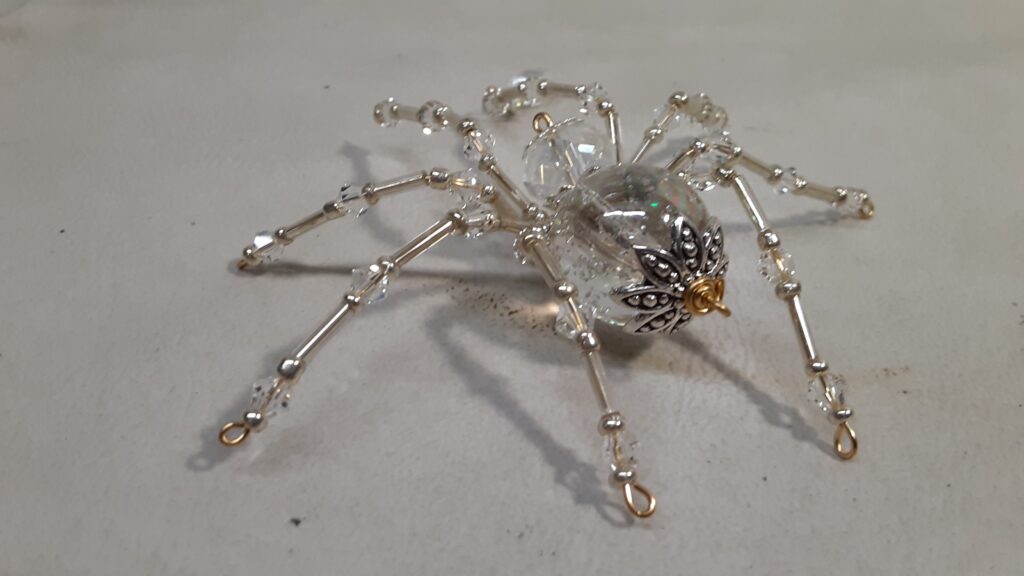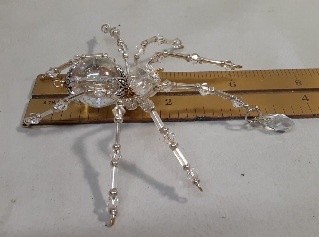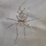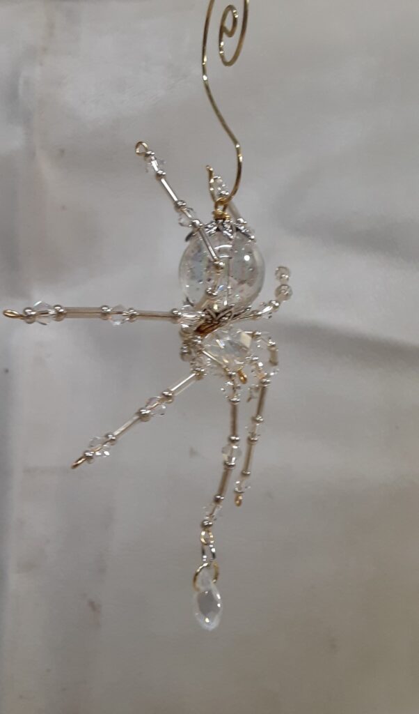 This is a handmade beaded crystalline ice spider. The abdominal area is made from a clear smooth bead that has glitter embedded in it and the head is a smaller faceted clear bead. The legs are made from flexible but sturdy 21 ga. brass wire which are covered with small clear Swarovski Glass and silver glass beads. Silver bead caps are also incorporated into the body. A gold decorative hook is attached to the back of the abdomen and can be used to hang the spider or be removed.