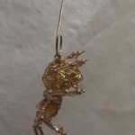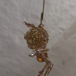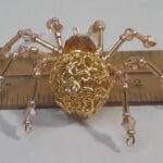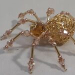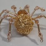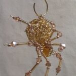 This is a handmade beaded crystalline golden spider. The abdominal area is made from a golden metal bead . The head is a smaller faceted Amber-tinted clear bead. The legs are made from flexible but sturdy 21 ga. brass wire which are covered with small Amber-tinted Swarovski Glass crystals and golden seed beads. Gold bead caps are also incorporated into the body. A gold decorative hook is attached to the back of the abdomen and can be used to hang the spider or be removed.