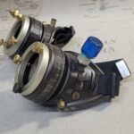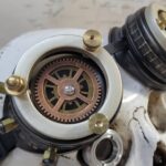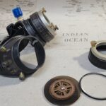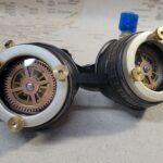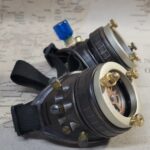-A blue aether bottle is attached to the left eyecup. -Nickel hued extension rings have been added to each eyepiece with brass knurled nuts as well. -Various findings are mounted to each side. -They include 2-50 mm clear glass lenses, 2-50 mm smoked lenses with attached gears, and a black elastic adjustable headband.