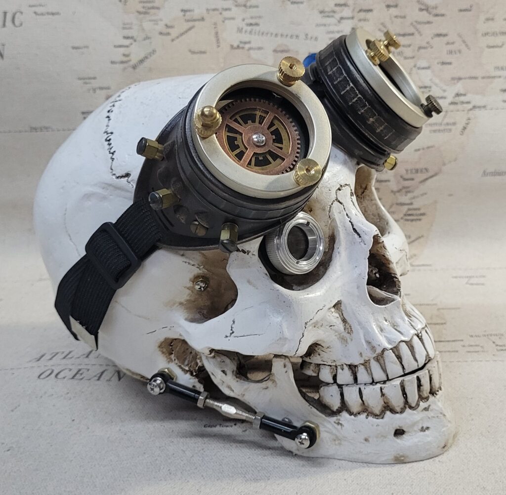 -A blue aether bottle is attached to the left eyecup. -Nickel hued extension rings have been added to each eyepiece with brass knurled nuts as well. -Various findings are mounted to each side. -They include 2-50 mm clear glass lenses, 2-50 mm smoked lenses with attached gears, and a black elastic adjustable headband.