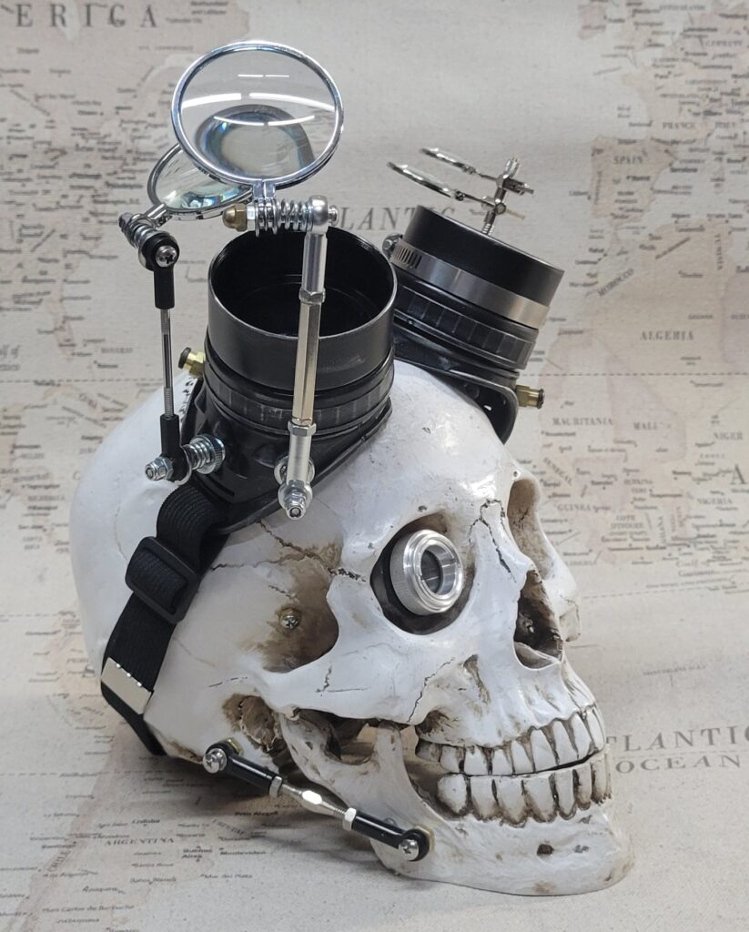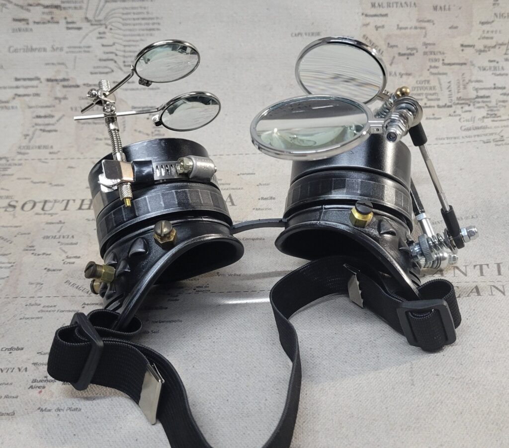 -2 large magnifying (5x each) loupes have been mounted to the right eye cup with a set of 2 (7.5x each) magnifying loupes mounted on the left.