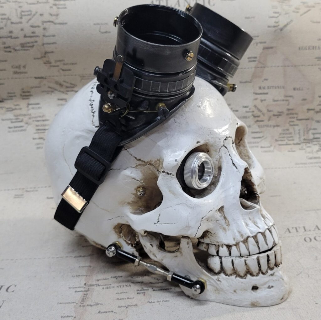 -They include 2-50 mm clear glass lenses, 2-50 mm smoked lenses, and a 3/4″ black elastic headband. -A few other various findings have been added and a vacuum tube to the left eye cup as well.