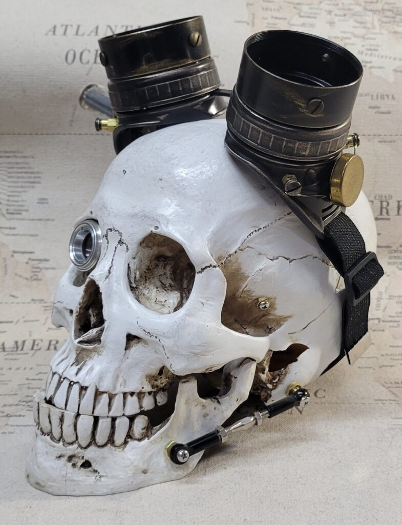 -Black distressed aluminum extension rings with gold highlights are attached to each eyepiece.
