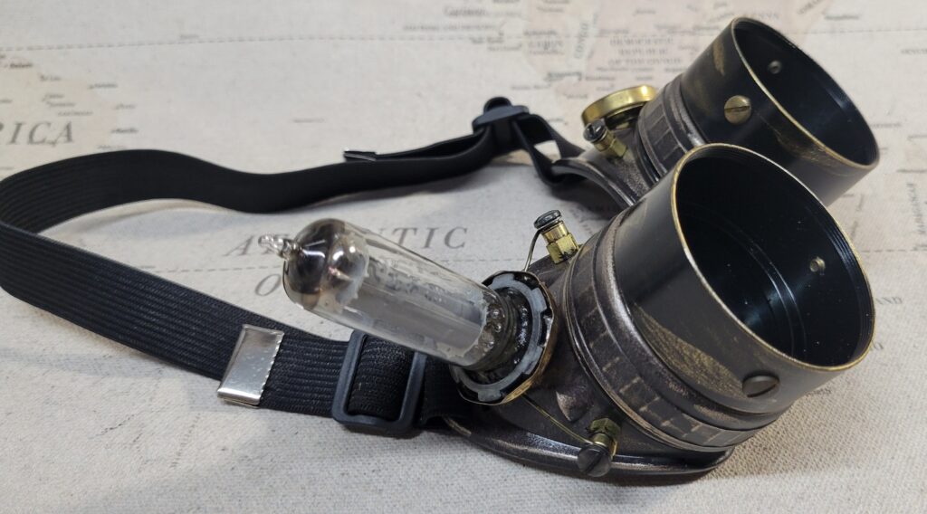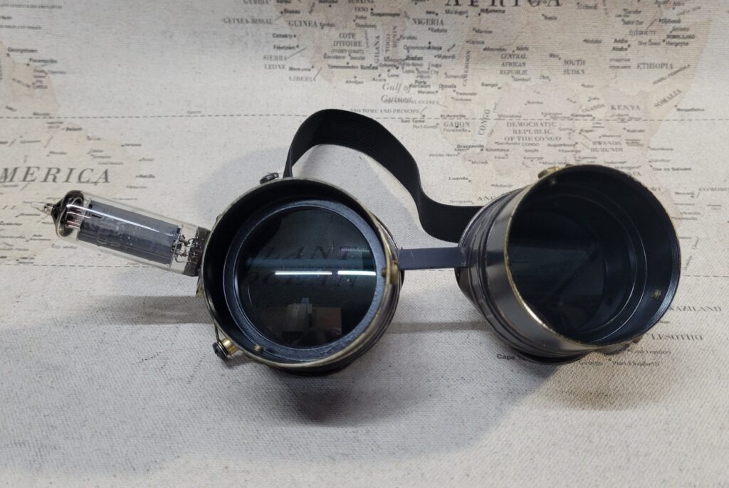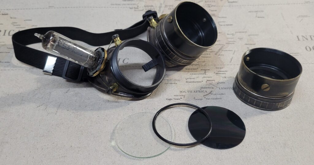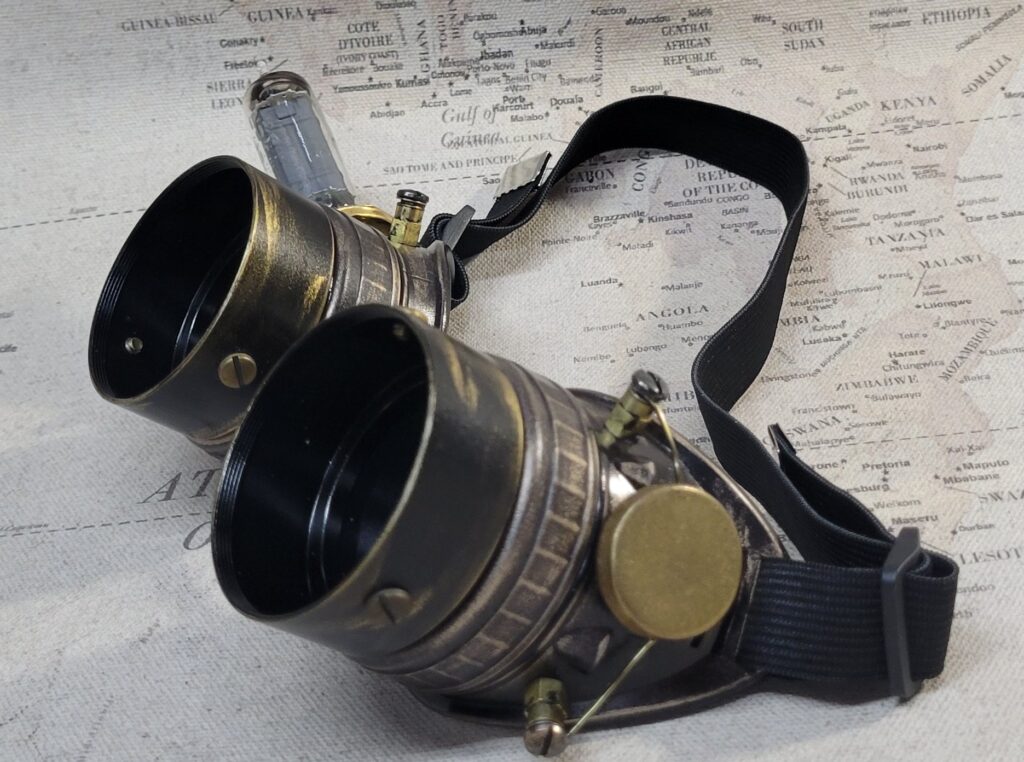 -They include 2-50 mm clear glass lenses, 2-50 mm smoked lenses, and a 3/4″ black elastic headband.                                                                                                     – A few other various findings and a brass button protector have been added as well.