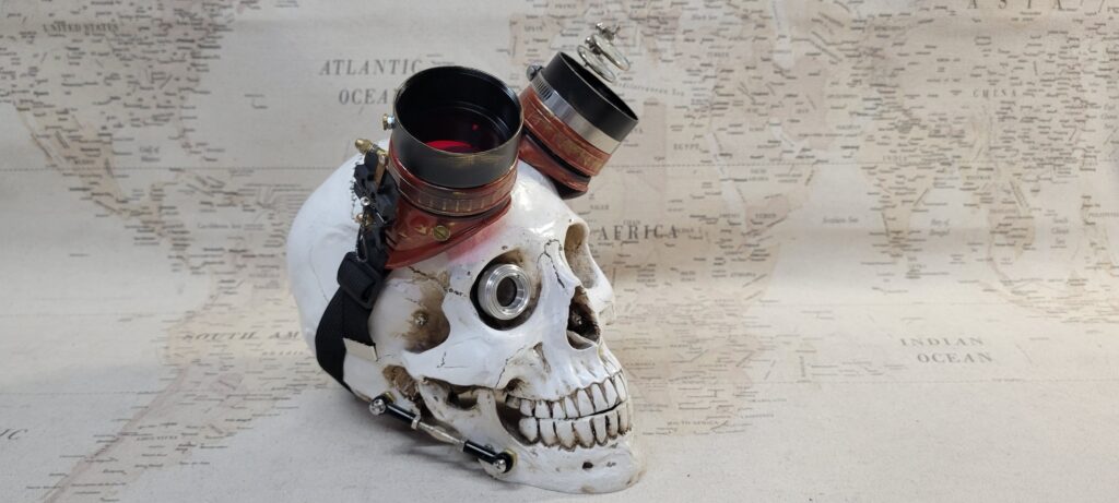 -Black distressed aluminum extension rings are attached to each eyepiece.