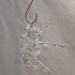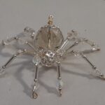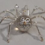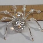 This is a handmade beaded crystalline ice spider. The abdominal area is made from a larger faceted clear glass crystal bead with a smaller faceted clear glass bead for the head. The legs are made from flexible but sturdy 21 ga. brass wire which are covered with small glass and clear plastic beads. Silver bead caps are also incorporated into the body. A silver decorative hook is attached to the back of the abdomen and can be used to hang the spider or be removed.