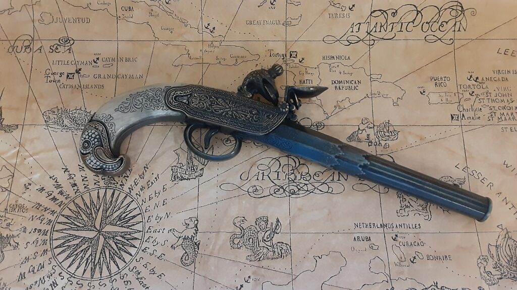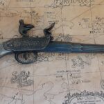– Trigger and flintlock articulates on pistol.