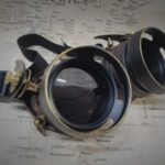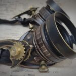 -Aged stamped zinc plated brass metal wings are mounted to the sides of the eyecups with brass knurled nuts and gears.
