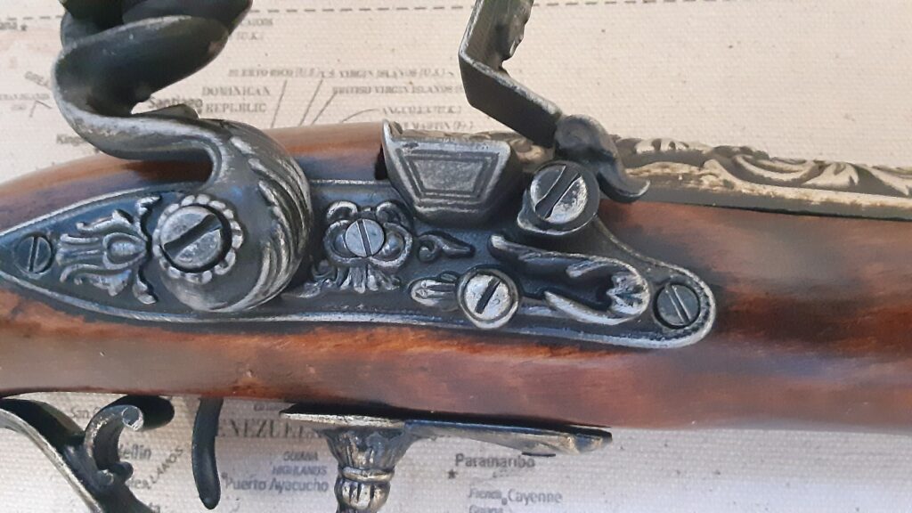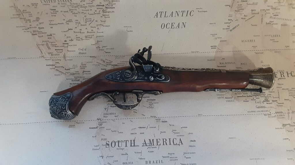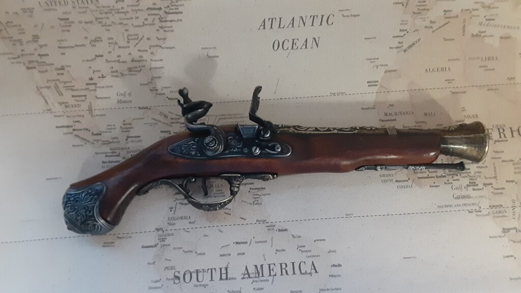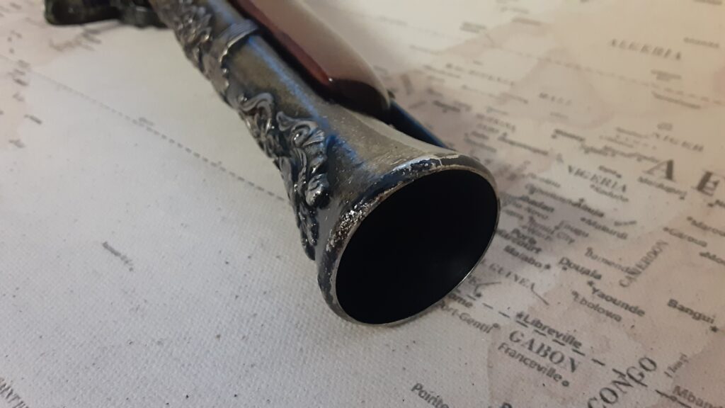 This is an aged version of a pirate’s flintlock blunderbuss pistol.