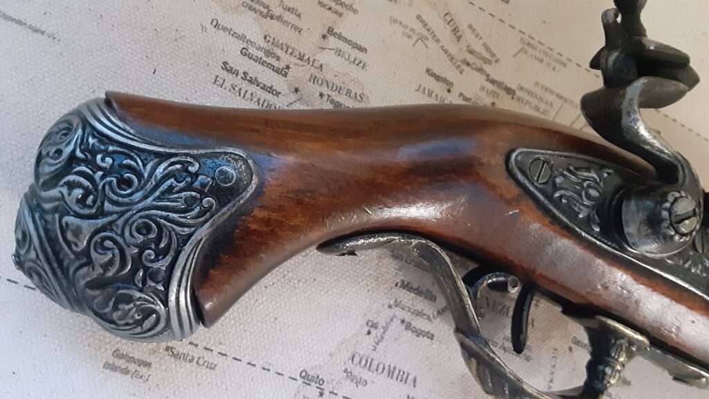 Butt of the gun has a brass pirates head on it.