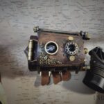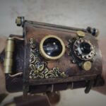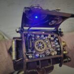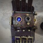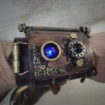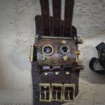 An ancient relic reputed to have been constructed by angelic hands in the pre-history of the Earth and handed down through the ages. This is a Steampunk Vortex Manipulator but can be used as an accessory for any Steampunk costume. The outer casing is made from steel with a distressed copper finish. It is mounted to a gear-embossed brown leather gauntlet which will attach to your arm. A single blue LED is mounted in the face and can be activated by a push button switch located on the face. A 12 volt battery powers the system. It weighs approximately 3 lbs. 6 oz. Various gears and other pieces are mounted inside to give it a Steampunk feel. Comes with an aged wooden display/storage case which has metal highlights.