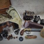 Also includes 1 small compass, a Steampunk-style lock blade pocket knife with belt clip, 2-60 ml brown glass bottles, 2 medium corked brown glass bottles, a simple small metal flask, a pair of brown distressed goggles, 1- brass and pewter pepperbox pistol with a brown leather belt holster, a small table world globe, and a small brass monoscope.