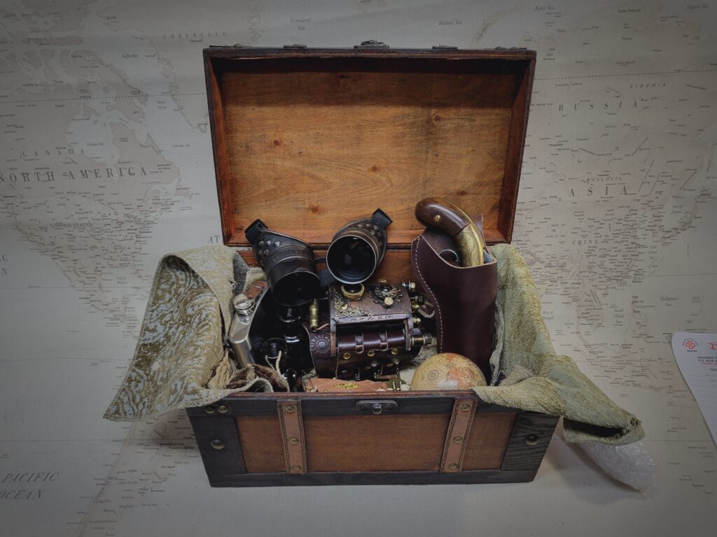 Also includes 1 small compass, a Steampunk-style lock blade pocket knife with belt clip, 2-60 ml brown glass bottles, 2 medium corked brown glass bottles, a simple small metal flask, a pair of brown distressed goggles, 1- brass and pewter pepperbox pistol with a brown leather belt holster, a small table world globe, and a small brass monoscope.