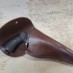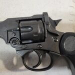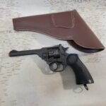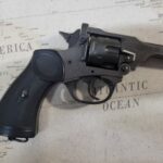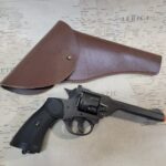 This is a replica of a MK IV Webley revolver produced in 1899. It weighs approximately 2.5 lbs. and is 10.25″ long with a black finish.